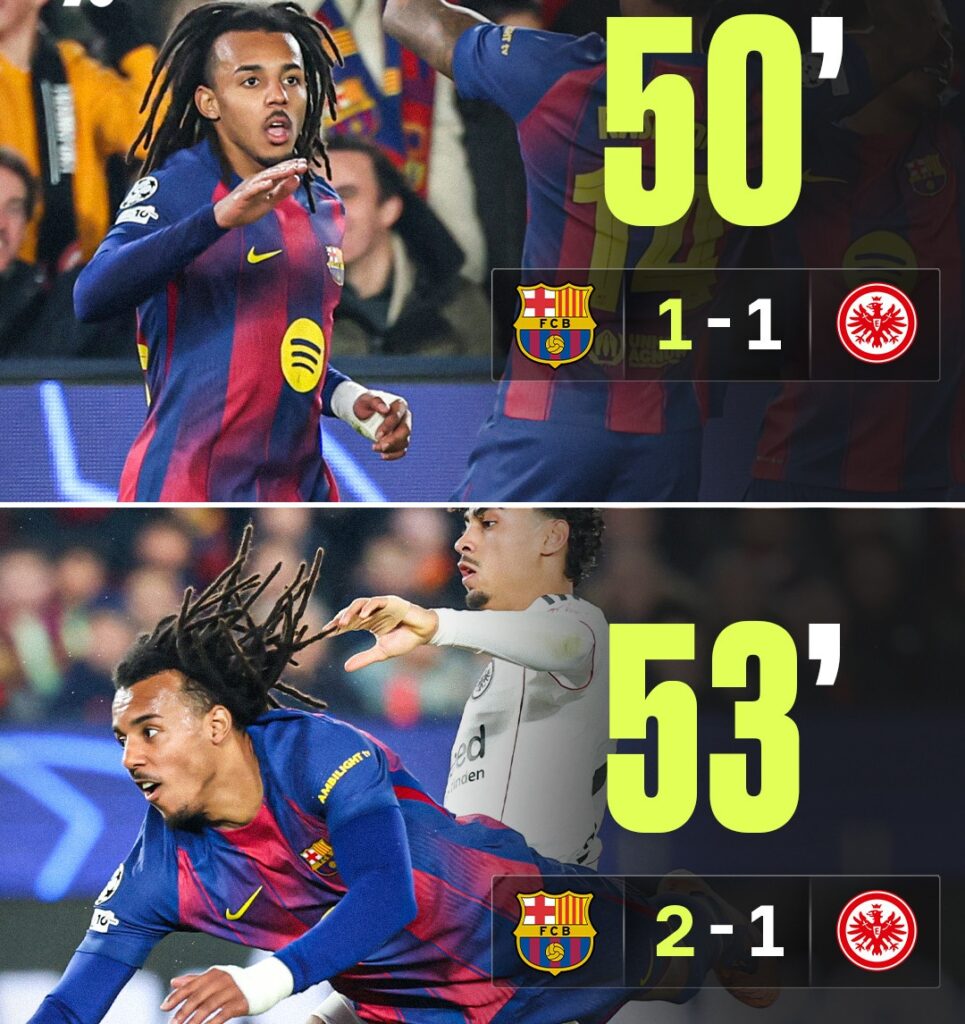Frankfurt bất ngờ vượt lên dẫn trước từ phút 21, tạo ra không ít khó khăn cho Barca với lối chơi phòng ngự số đông. Tuy nhiên, bước ngoặt đến ngay đầu hiệp hai. Từ đường tạt bóng chuẩn xác của Rashford, Kounde bật cao đánh đầu gỡ hòa 1-1. Chỉ ít phút sau, phút 53, tài năng trẻ Yamal rót bóng sâu vào vòng cấm và vẫn là Kounde chọn vị trí chuẩn xác để đánh đầu nâng tỷ số lên 2-1.